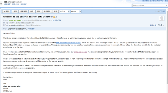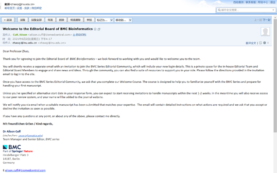 近日,多宝官网计算机与软件工程学院教授赵琪收到BMC出版集团Dylan Smith博士邀请,受邀分别担任BMC Genomics和BMC Bioinformatics编委。