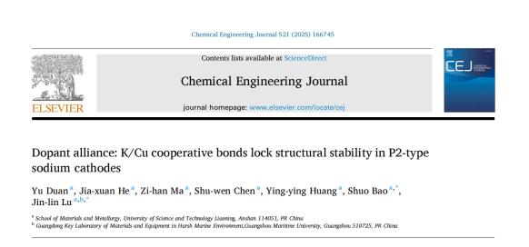 近日,多宝官网材料与冶金学院包硕副教授联合广州航海学院(广州交通大学筹)路金林教授,以多宝官网为第一署名单位,在国际知名期刊《Chemical Engineering Journal》(中科院1区top期刊,2025年影响因子:13.2)发表高水平研究论文《Dopant alliance: K/Cu cooperative bonds lock structural stability in P2-type sodium cathodes》(https://doi.org/10.1016/j.cej.2025.166745),第一作者为多宝(中国)一站式服务官网2023级硕士研究生段玉。