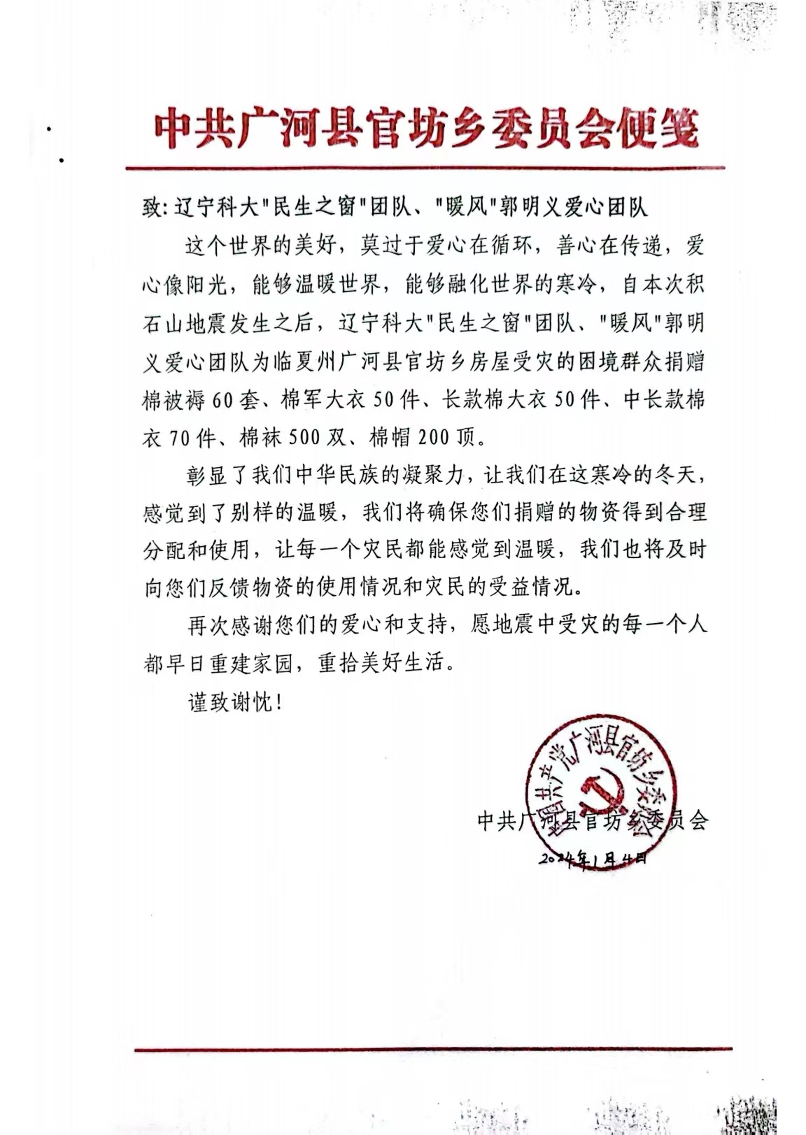 2023年12月18日,甘肃临夏州积石山县发生6.2级地震,造成重大人员伤亡,部分水、电、交通等基础设施受损。地震灾害发生后,多宝官网“民生之窗”团队、“暖风”郭明义爱心团队第一时间启动应急救援响应,动员部分师生党员志愿者通过辽宁省多宝官网教育基金会募集抗震救灾专项基金近2万元,为地震灾区尽绵薄之力。