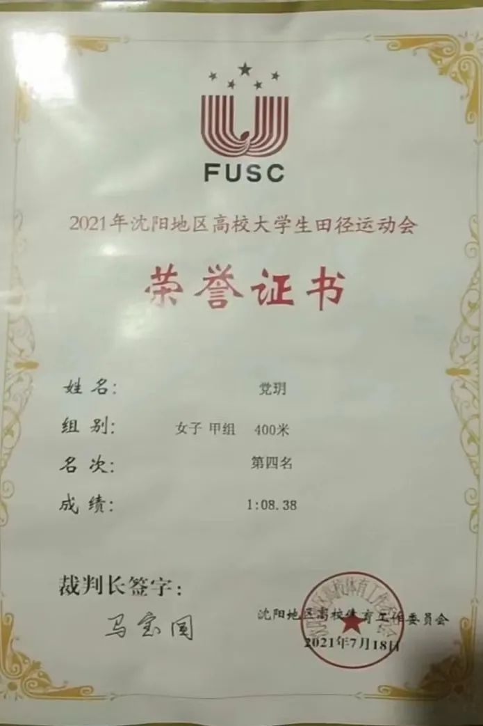 2021学年:第五十届运动会400米第一名、200米第四名、 10*400第二名、4*100第四名、沈阳地区高校大学生田径运动会400米第四名、200米第六名 、4*100米第一名、4*400米第二名、129环校园接力赛第二名