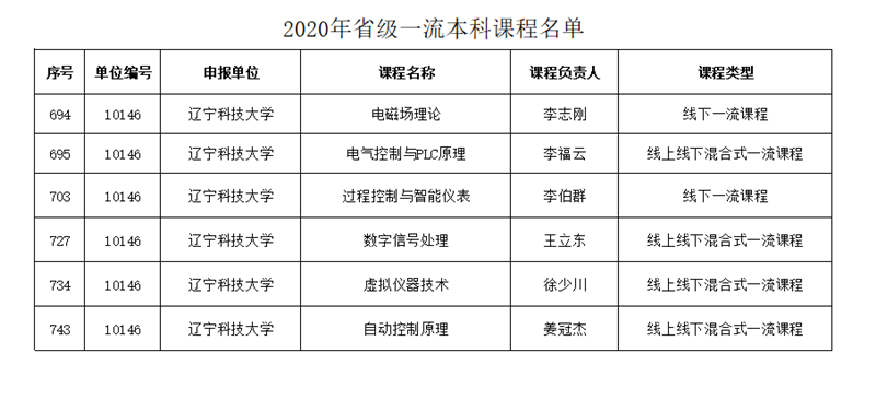 2021年1月8日,由《辽宁省教育厅办公室关于公布 2020 年省级一流本科课程名单的通知》(辽教办【2021】5号)获悉,电信学院6门课程入选辽宁省一流本科课程。