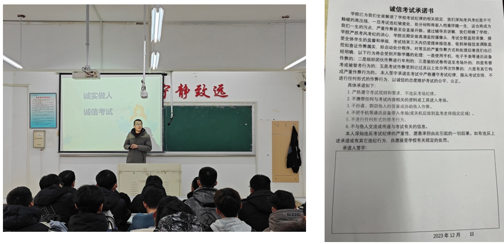 各专业班级通过主题班会等方式开展诚信考试宣传教育,辅导员带领全体同学认真学习了《多宝官网学生考试违纪处理细则》等文件,并通报了以往因考试作弊受到处分的案例、严重后果。帮助同学们从思想上认识到诚信考试的重要性和必要性,全体学生签署了《诚信考试承诺书》,承诺依靠自己的努力学习取得优异成绩。