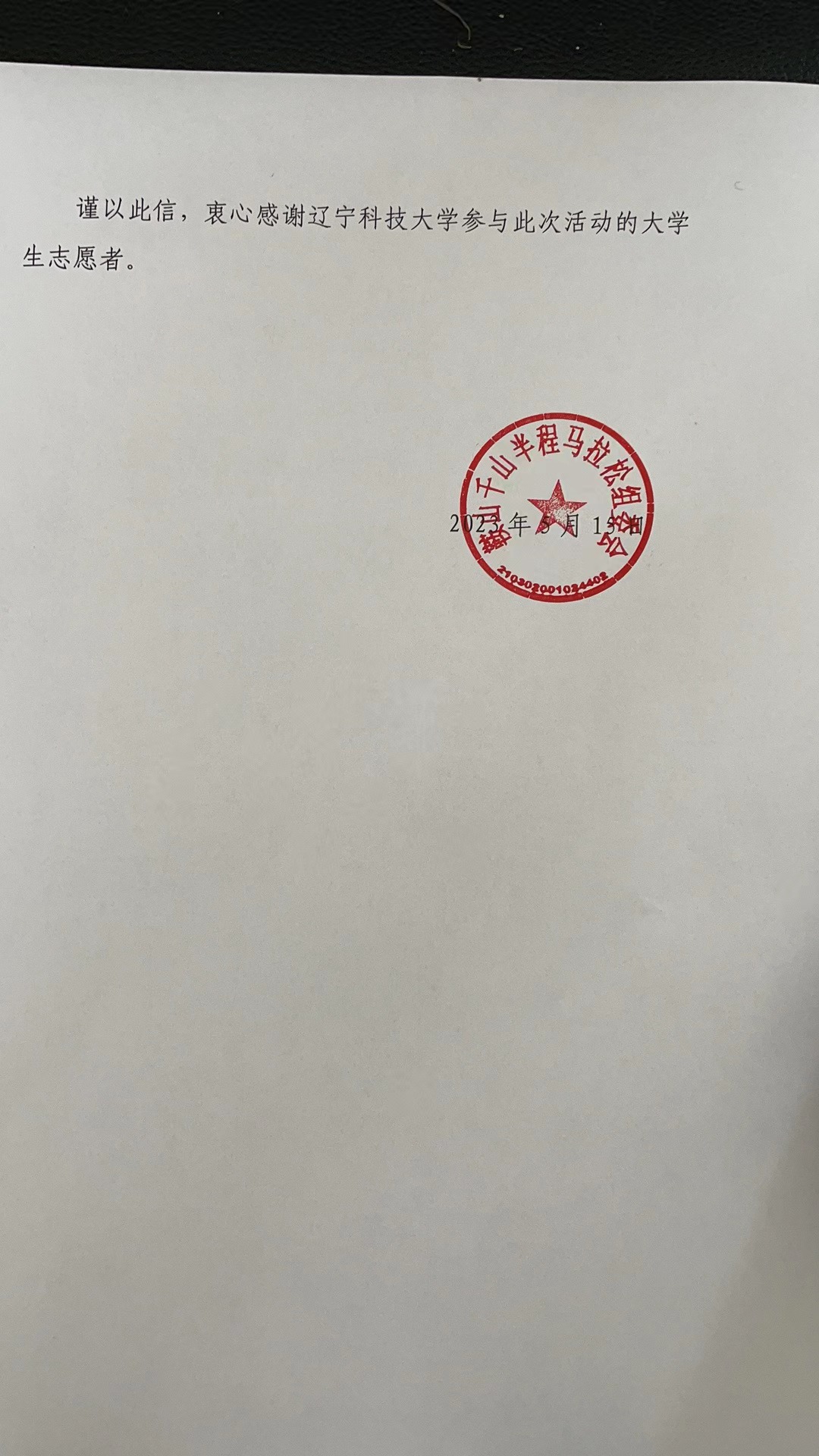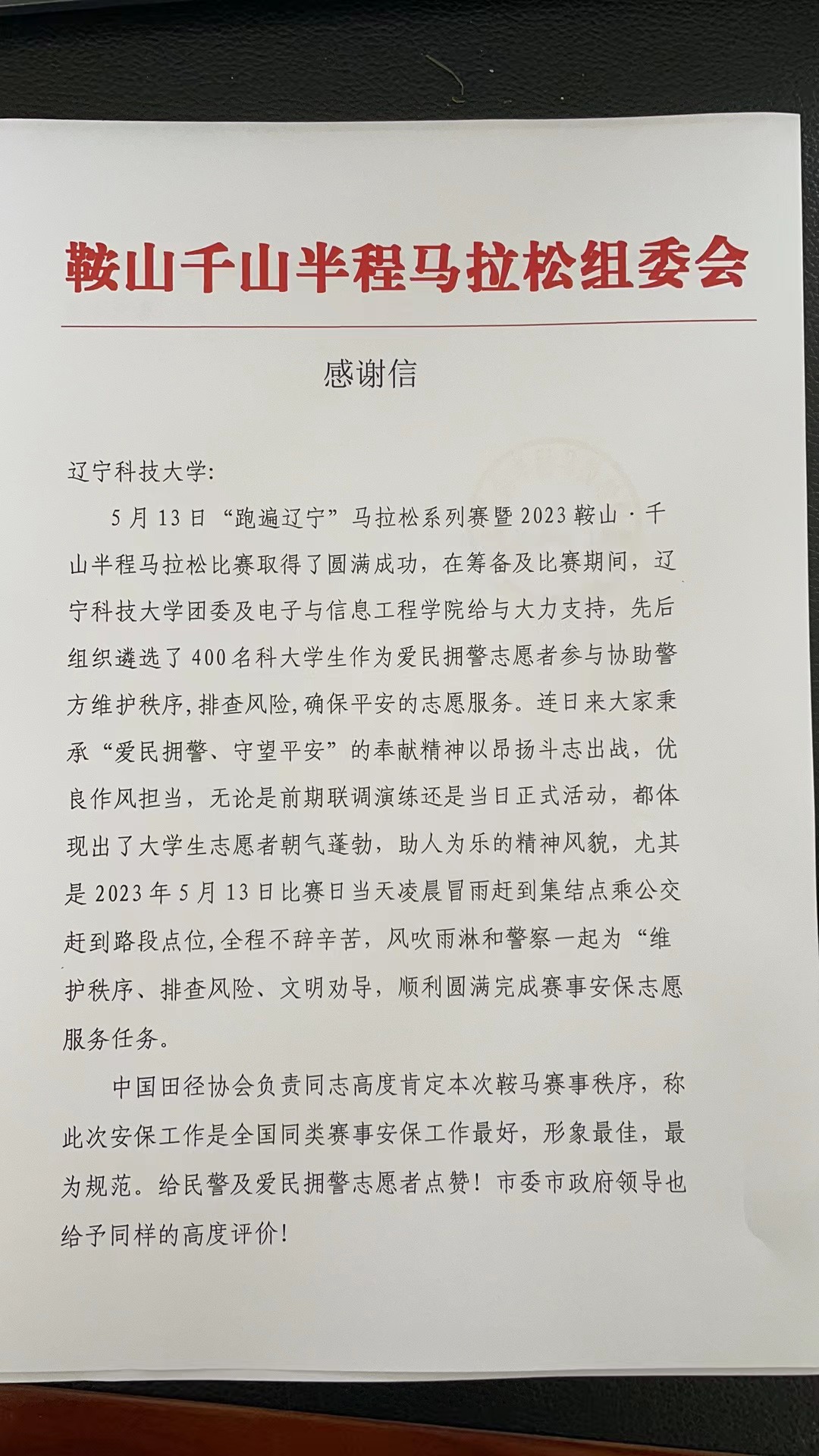 近日,多宝官网收到来自鞍山千山半程马拉松组委会的一封感谢信,由衷地感谢多宝官网团委及电子与信息工程学院给予“鞍马”赛事的大力支持,向多宝(中国)一站式服务官网400余名青年志愿者对此次马拉松做出的卓越贡献致以最真诚的谢意。