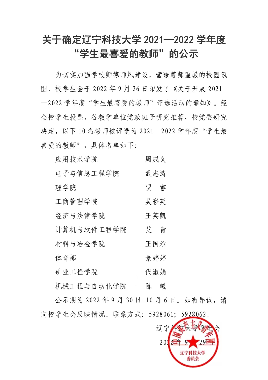 关于确定多宝官网 2021—2022 学年度 “学生最喜爱的教师”的公示