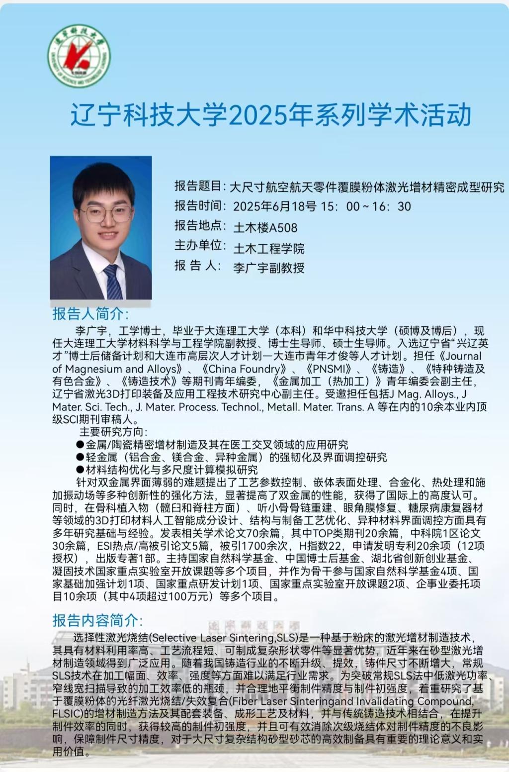 学术预告:大尺寸航空航天零件覆膜粉体激光增材精密成型研究