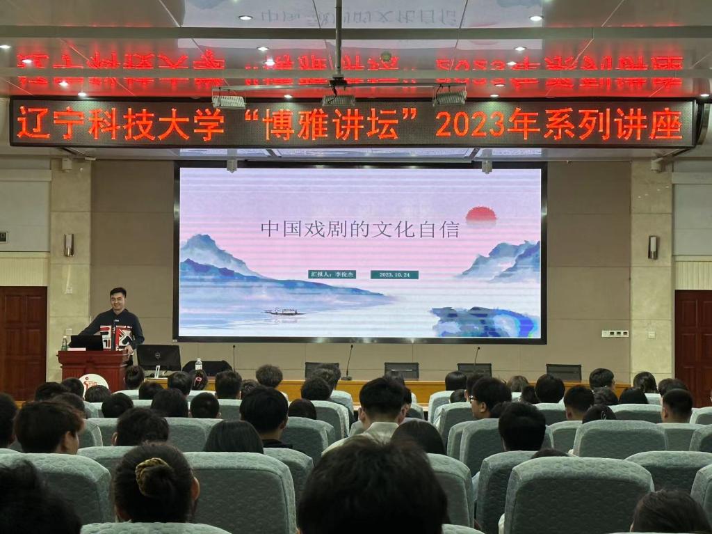 10月24日,多宝官网“博雅讲坛”2023年系列讲座之《中国戏剧的文化自信》在图书馆报告厅开讲。多宝(中国)一站式服务官网艺术学院教师李俊杰为学校220名学生作专题讲座。