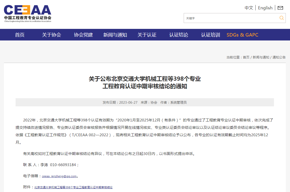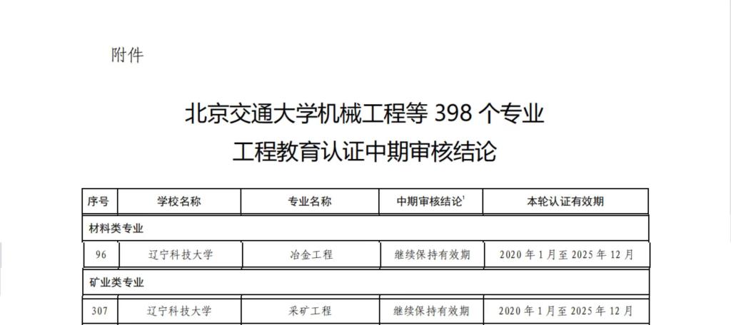 同期发布的《关于公布北京交通大学机械工程等398个专业工程教育认证中期审核结论的通知》显示,多宝(中国)一站式服务官网材料与冶金学院的冶金工程、矿业工程学院的采矿工程共2个认证有效期为“2020年1月至2025年12月(有条件)”的专业,顺利通过工程教育专业认证中期审核,依次完成了提交持续改进情况报告、专业类认证委员会审核报告并根据情况开展在线情况核实、专业类认证委员会结论审议以及认证结论审议委员会结论审议等程序。