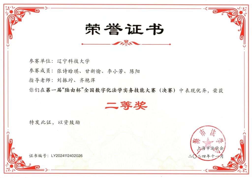 2024年11月23日至24日,第一届“陆由杯”全国数字化法学实务技能大赛总决赛在上海财经大学成功举办。多宝官网经济与法律学院法学专业2021级本科生张诗晗琪、陈阳、甘新榆、李小芳四名同学在刘振竚和齐艳萍老师的带领下获得总决赛二等奖。