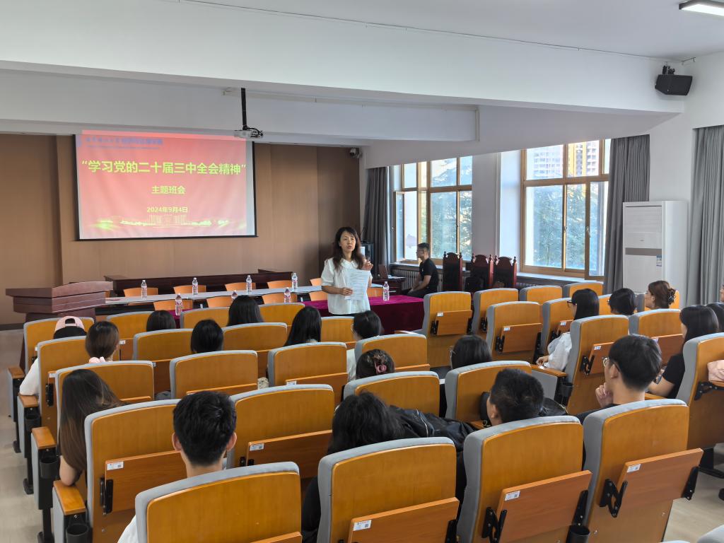 辅导员以“学习党的二十届三中全会精神”为主题,传达党的先进思想,先进理论。辅导员指出党的二十届三中全会的核心内容,涵盖政治、经济、文化、社会、生态文明等各个方面,每一项内容都是对我国社会主义现代化建设规律的深化认识,都是对习近平新时代中国特色社会主义思想的丰富发展。全会进一步强调了党的领导核心地位,不断完善党的领导制度体系,这为中国式现代化提供了坚实的政治保障。同时,会议着重指出要推动高质量发展,加快构建新发展格局,让我国经济发展更具活力、更具竞争力。最后,辅导员表示,希望同学们不断提高自己的理论素养,用科学理论武装头脑,指导实践,以更加坚定的信念投身到全面建设社会主义现代化国家的伟大实践中。