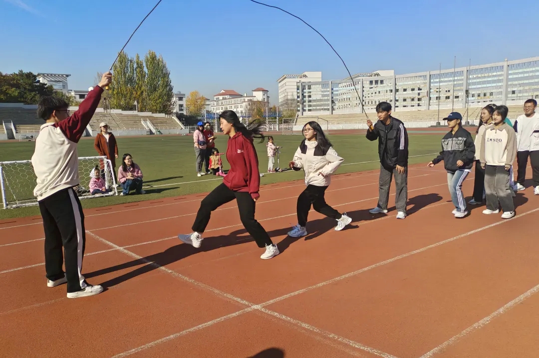 同学们一边配合着绳子的旋转