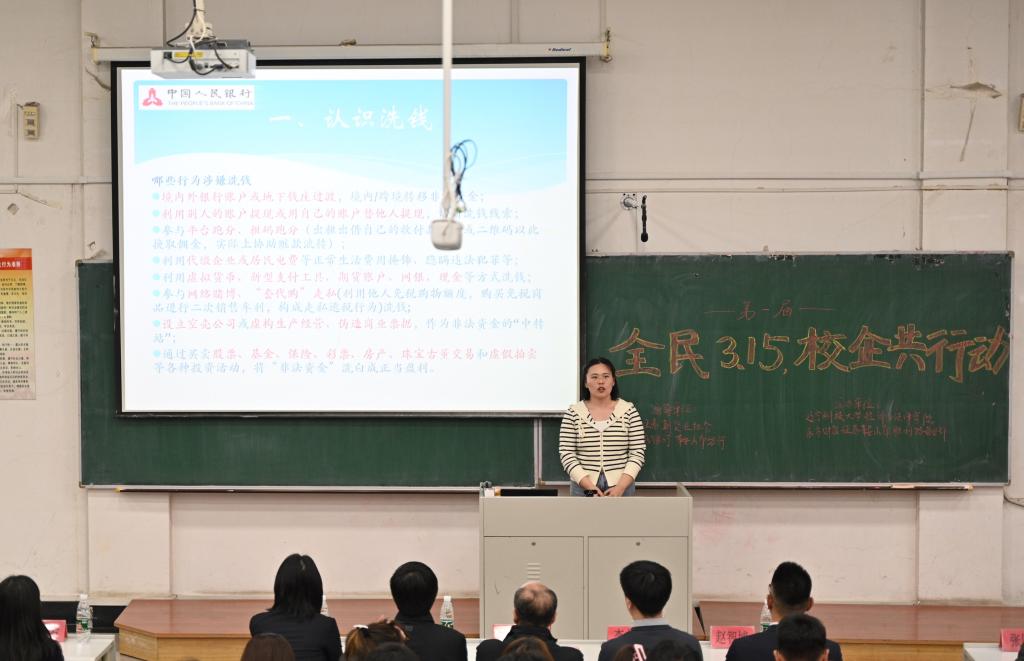 活动伊始,中国人民银行鞍山分行副行长刘纪首先致辞,随后由东方财富证券鞍山营业部工作人员姜英东作《走进基金的世界,开启我的第一堂基金课》主题宣讲。中国人民银行科员韩玮为同学们普及了反洗钱常识及对应的公民义务,带领大家了解到什么是洗钱、洗钱相关法律法规、洗钱的危害以及反洗钱监管体制等,并通过洗钱案例警示大家远离洗钱,勇于举报洗钱活动。随后易方达基金公司代表向同学们介绍了基金从业和职业生涯规划等方面的内容,并从自身出发,分享职业经历,让同学们对基金运行和基金市场产生了更直观、更深入的认识。讲解过后,同学们针对当前基金环境和未来发展方向提出了自己的困惑和想法,代表们给予了耐心且详细的解答。最后,学院党委书记赵智博作总结发言,他首先对各企方代表的到来表达了感谢,宣布由东方财富证券鞍山营业部携手多宝官网经法学院举办的第一届“全民3.15,校企共行动”活动正式开启,并表示此次活动在指导大学生就业实践方面具有重要意义,鼓励同学们积极参与其中,同时期待未来校企继续携手与时俱进,协同育人,实现双向奔赴。