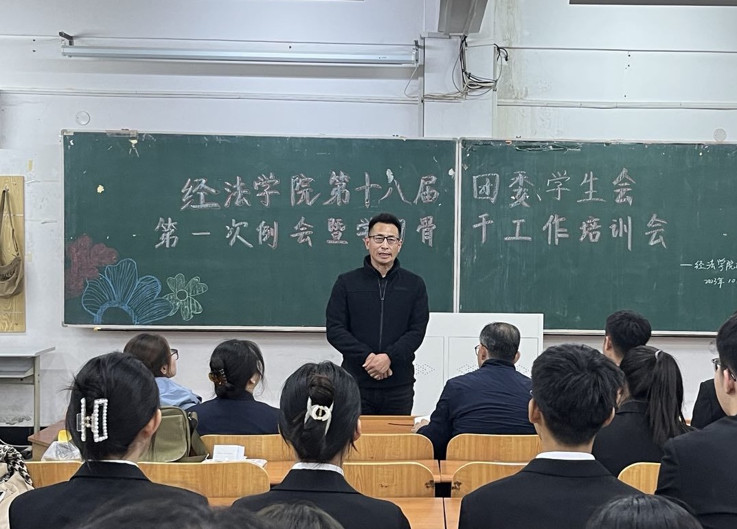 10月23日下午,经法学院第十八届团委、学生会第一次例会暨学团骨干工作培训会在博学楼C112举行。学院党委书记赵智博、党委副书记张国华、团委副书记张鹏飞出席会议,经法学院学生会全体学团骨干参加了本次会议。会议由经法学院第十八届学生会执行主席兼办公室负责人吴雨纯主持。