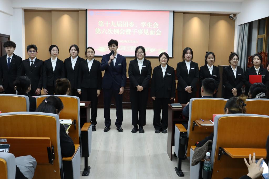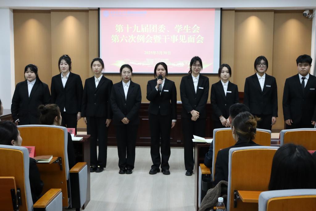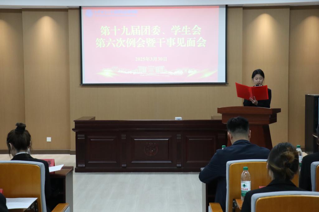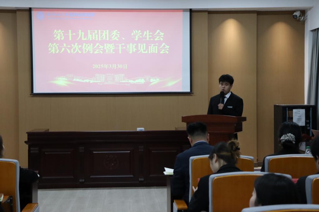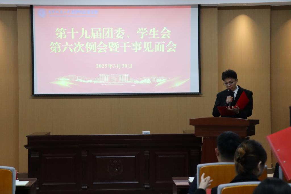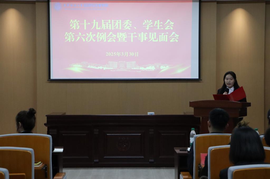 3月30日,经法学院于博识楼A402召开第十九届团委、学生会第六次例会暨干事见面会。会议由院学生会主席团成员许秀主持,院团委副书记张鹏飞出席会议,院第十九届团委、学生会全体团学骨干参加了会议。
