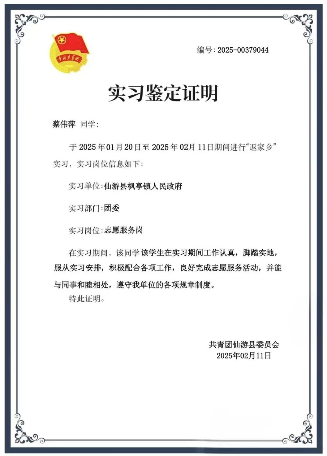 蔡伟萍,女,共青团员,法学24班学生,现任班级组织委员。寒假期间她积极投身“返家乡”社会实践活动,在仙游县枫亭镇人民政府进行了为期二十天的志愿服务。