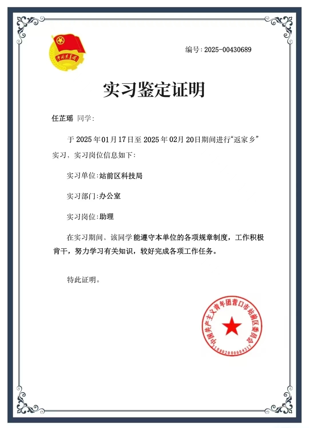 任芷瑶,女,共青团员,金融24-1班学生,现任班级班长。寒假期间她积极响应“返家乡”社会实践号召,在营口市站前区科技局开展为期一个月的志愿服务。