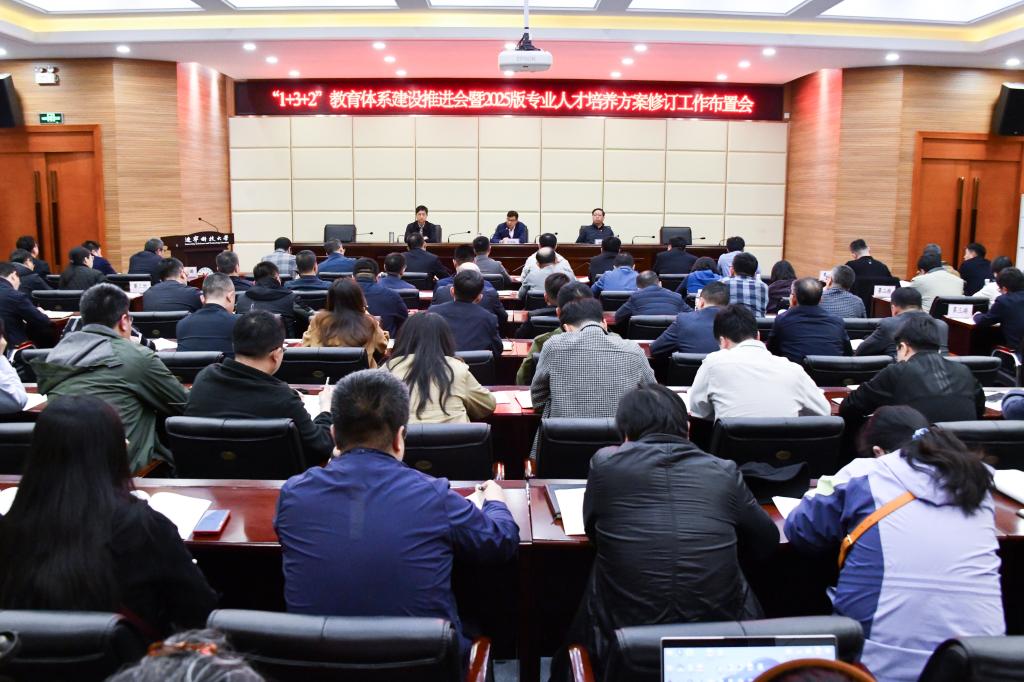 胡军对教务处关于“1+3+2”教育教学体系建设工作的落实方案以及2025版专业人才培养方案修订的工作布置给予肯定,并从学校宏观战略发展的层面对“1+3+2”教育教学体系建设工作做出全面部署。他谈到,学校在3月份召开的年度工作会议上,总结了2024年的工作成效,并面向全校部署了2025年的工作任务,将党务工作的重点明确为四大党建任务,即干部换届、召开第四届党代会、省委巡视工作反馈意见整改、深入贯彻中央八项规定精神的主题教育学习;将行政工作的重点定位在六大专项改革上,即以产教融合为重点的“1+3+2”教育教学体系改革、以需求和问题为牵引的有组织科研模式改革、以服务振兴为目的的校地服务机制改革、以价值贡献为导向的人事人才制度改革、以扶优扶强为规则的学科管理体制机制改革、以正风反腐为主线的内部治理结构改革。胡校长指出,“1+3+2”教育教学体系建设是孟书记基于钢铁头部企业三十年的工作经历提出的重要改革举措,它在宏观上能够充分体现教育的政治属性、人民属性、战略属性,在微观上能够直面学校本科教育教学的建设缺口,帮助学生建立內驱式自激励成长模式,突破发展瓶颈,打造上手快、适应快、发展快的职业进阶路径。为了切实有效地做好这项改革建设工作,要求全校以2025版专业人才培养方案和课程教学大纲修订为抓手,多措并举,推动理念入脑、入心、入课堂,将体系内涵概念化、基因化、具象化,确保每一个建设主体都能够正确认识并深刻理解体系内涵,明确自己在改革中需要承担的工作任务,将“1+3+2”教育教学体系所承载的“以学生为中心”的育人理念烙印在每一位老师的心中,将面向产出的育人导向体现在每一门课的教学方案中,将“授人以渔”的教学方式发展为能力培养过程中一种自动自觉的实践行为。同时,也希望通过“1+3+2”教育教学体系建设的推进过程,能够让每一个“科大人”都认识到本科教学在学校工作中的中心地位,教学单位和职能处室要全力打好配合战,主动探索和拓展教学改革的空间和可能性,推动课堂革命,创新教育教学模式,促进育人方式转变,以现有本科专业教育教学体系改革成效为基础,助力学校圆满完成优质本科扩容建设工作。