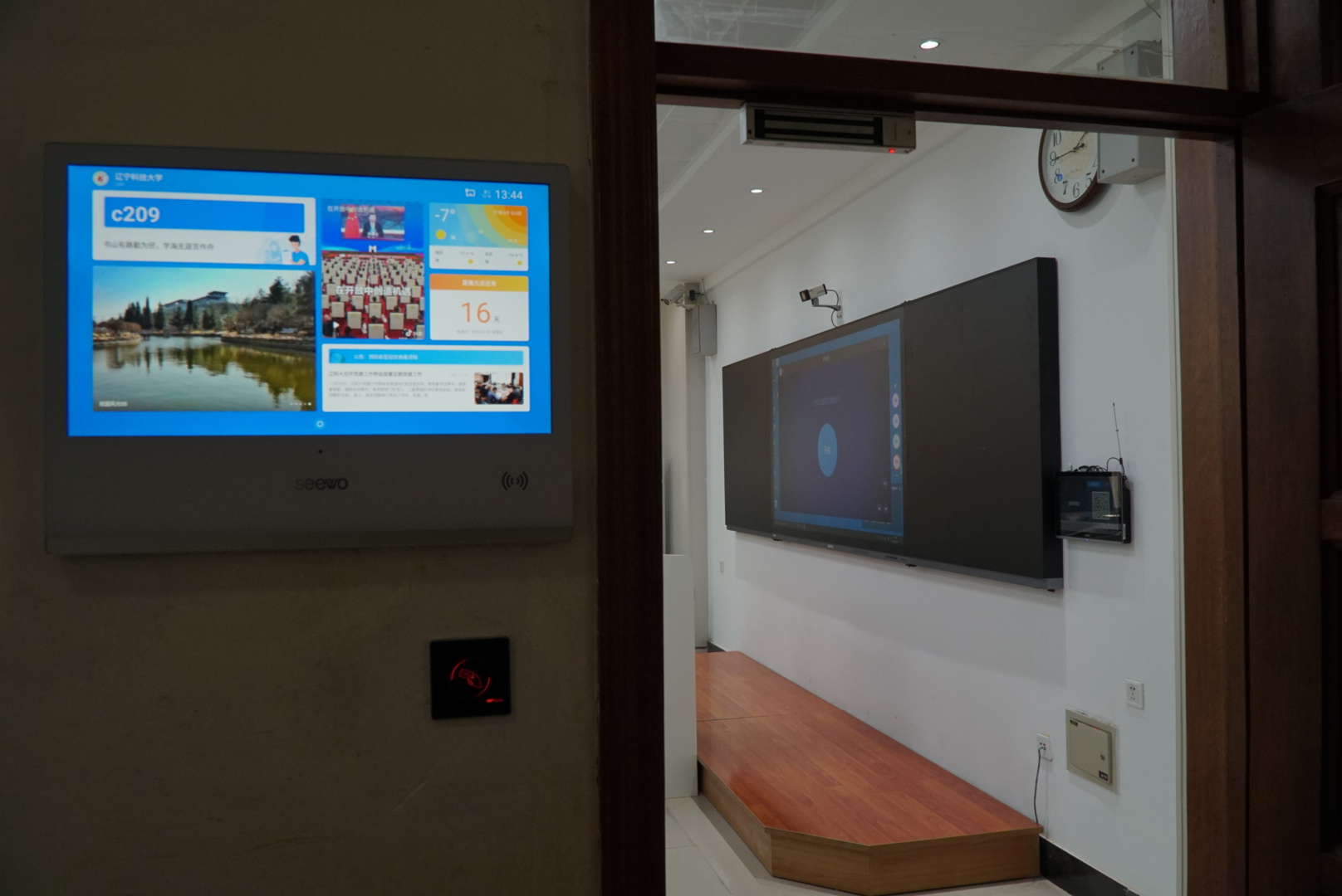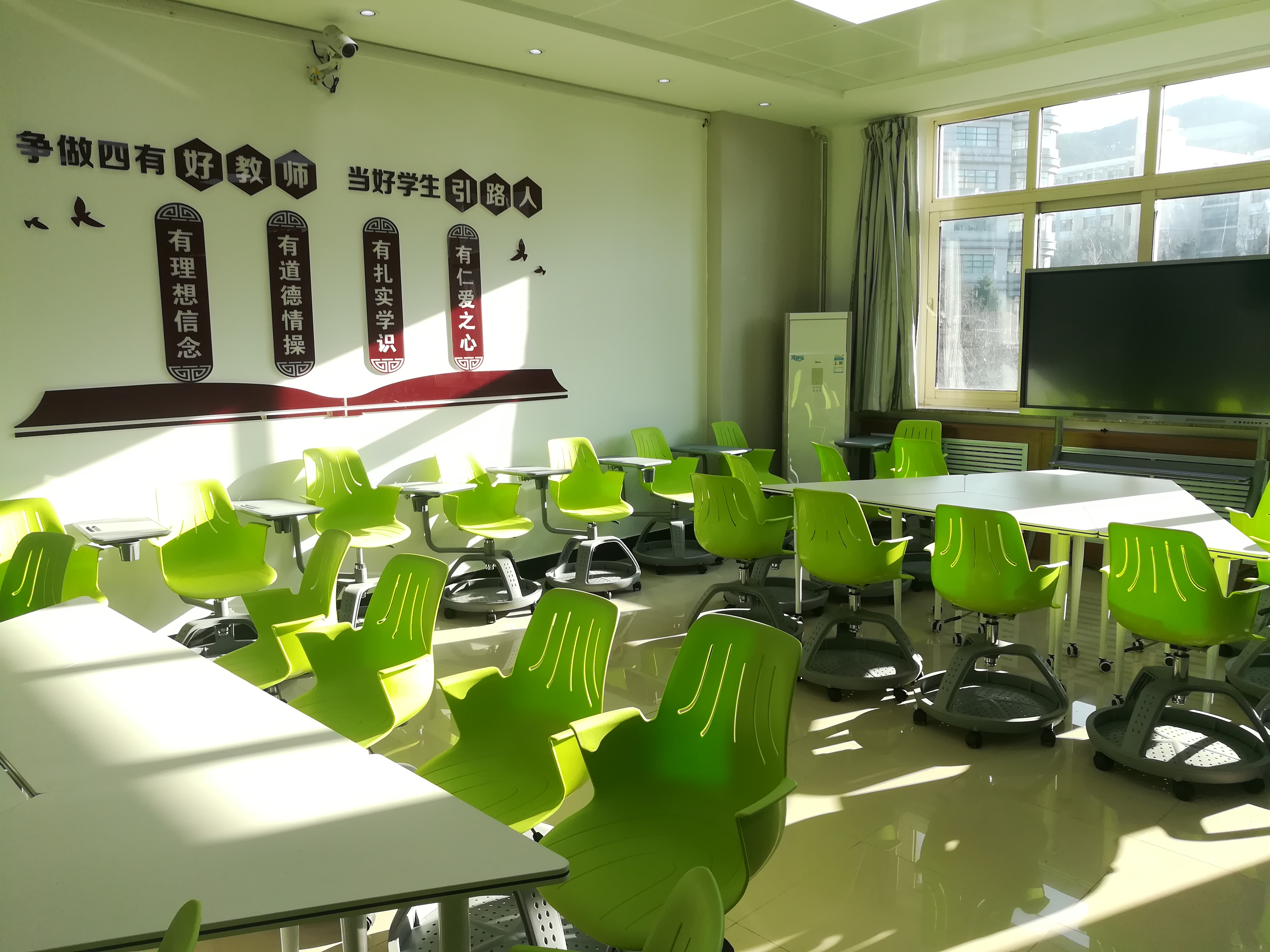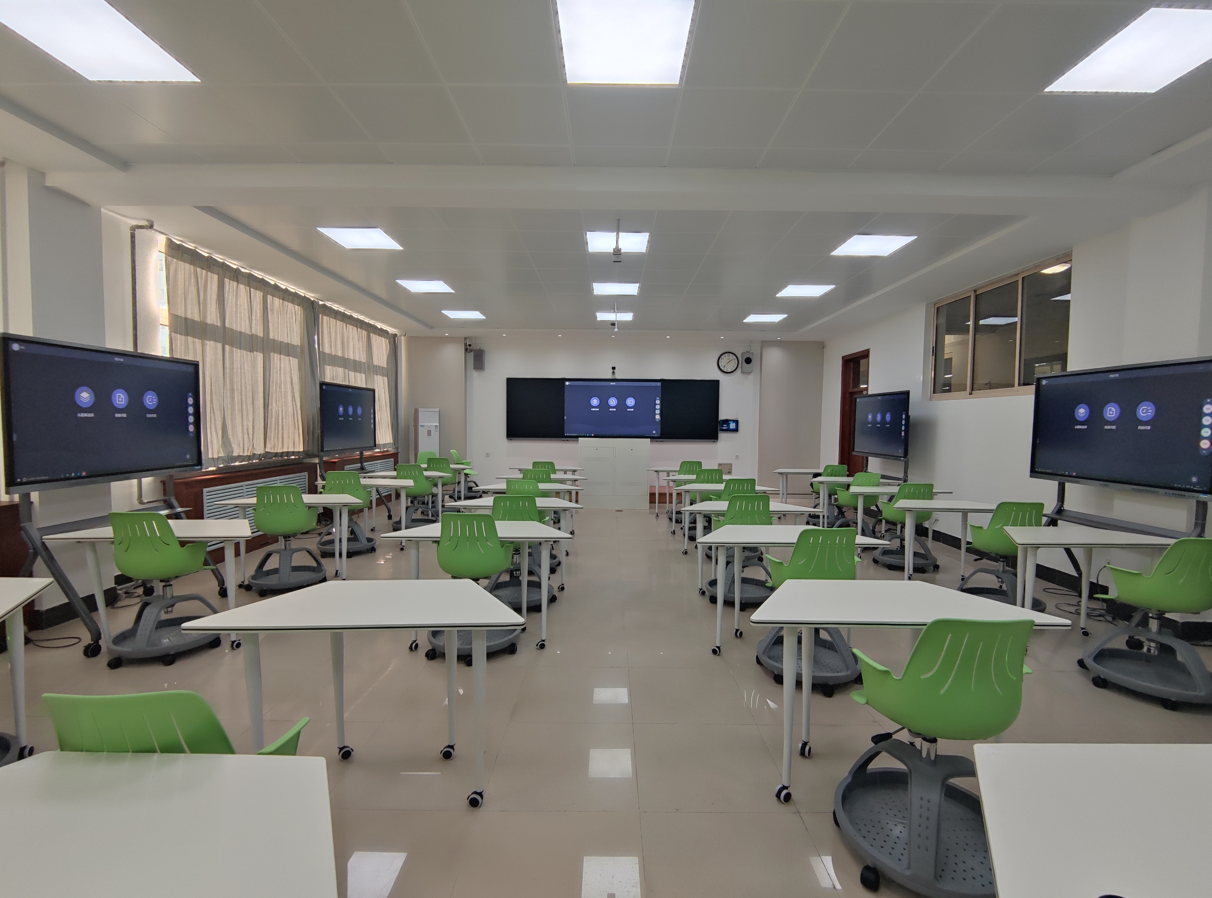 目前,学校已建成10间智慧教室,引进了雨课堂、超星智慧互动平台,科大讯飞网上阅卷系统平台;在22间大型合班教室安装了吊麦扩音系统;明德楼24间教室安装了希沃86寸触控一体机,覆盖率100%,博学楼更换100台多媒体电脑主机,并部署了桌面云系统;博学楼C区29间多媒体教室及9间智慧教室安装了万迅中控设备,实现了对投影机、电脑、扩音系统等设备的运行状态远程监控,并可以实现在线听课功能;新建传统多媒体教室37间。