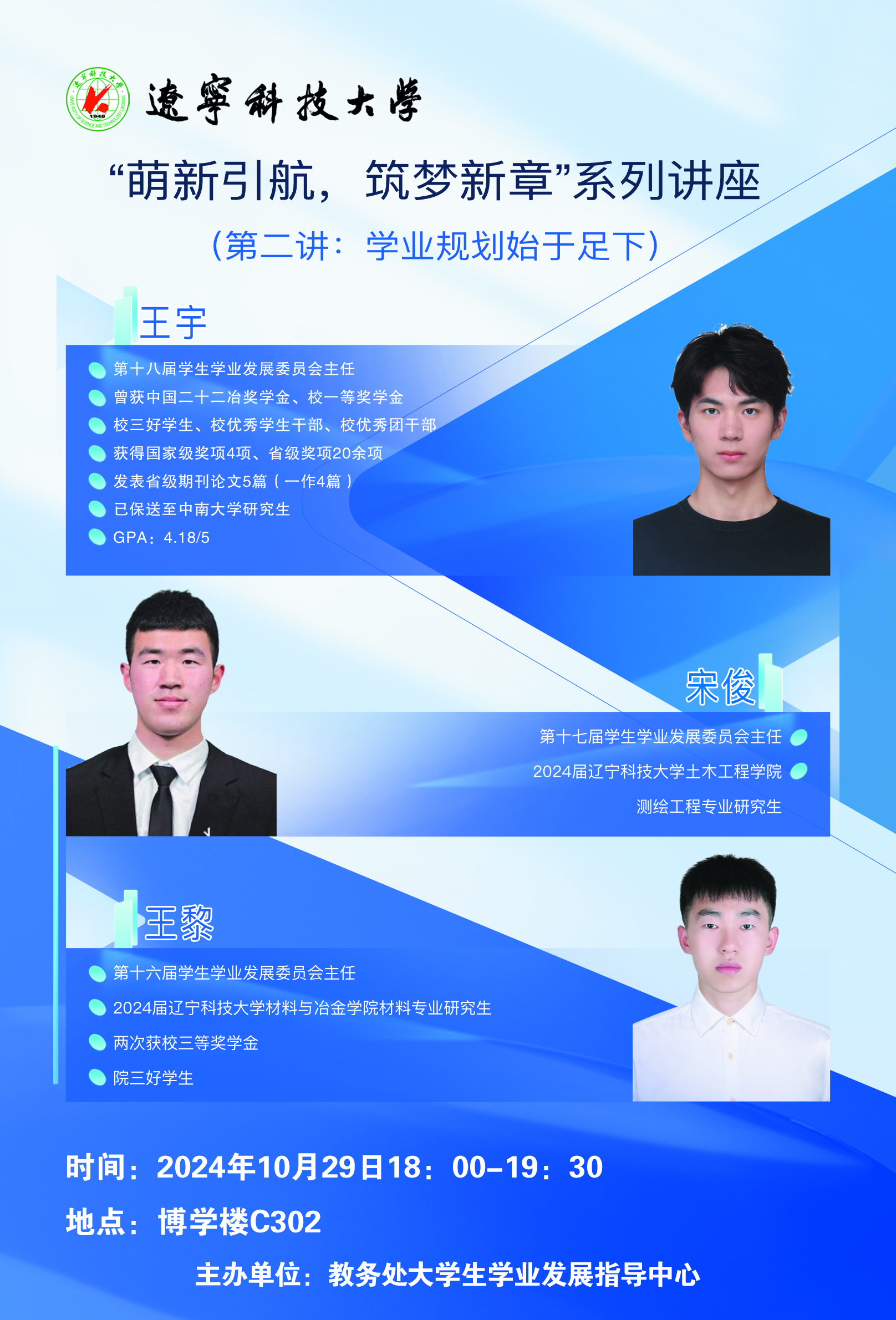 10月29日,教务处大学生学业发展指导中心面向2024级新生举办的“萌新引航,筑梦新章”系列讲座第二讲《学业规划始于足下》在博学楼C302教室开讲。多宝(中国)一站式服务官网学生学业发展委员会历届主任王宇、宋俊、王黎为学校300余名新生作讲座。