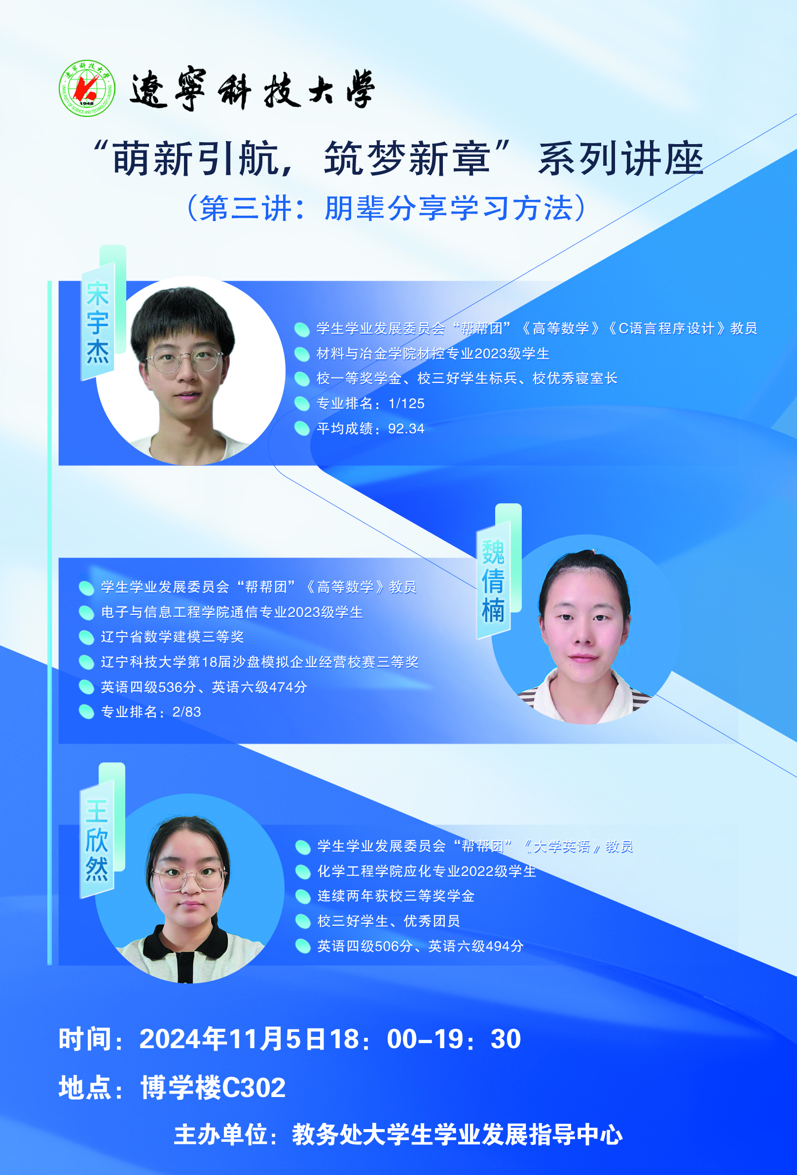 11月5日,教务处大学生学业发展指导中心面向2024级新生举办的“萌新引航,筑梦新章”系列讲座第三讲在博学楼C302教室开讲。多宝(中国)一站式服务官网学生学业发展委员会“帮帮团”教员魏倩楠、王欣然、宋宇杰为学校300余名新生作《朋辈分享学习方法》专题讲座。
