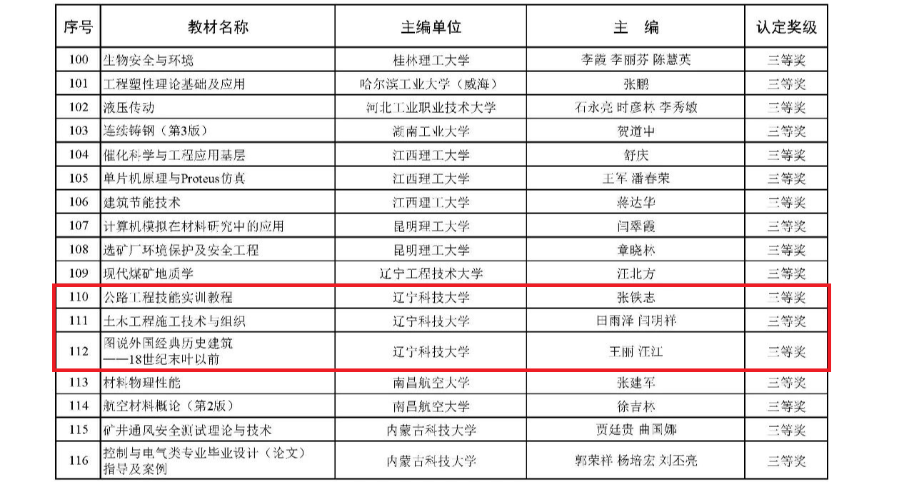 李雪、夏垒、井玉安等主编的《材料成型过程传热原理与设备(第2版)》和王立萍、廖桂兵、朴景威等主编的《机械设备维修工程学(中英文对照)》2部教材获二等奖,张铁志主编的《公路工程技能实训教程》,田雨泽、闫明祥主编的《土木工程施工技术与组织》,王丽、汪江主编的《图说外国经典历史建筑—18世纪末叶以前》3部教材获三等奖。此次获奖的5部教材涵盖了材料科学与工程、机械工程、土木工程等专业领域,内容丰富、特色鲜明,具有较高学术价值和教学实用性。它们凝聚了教师多年来教学经验和科研成果,也反映了相关行业最新发展动态和技术要求。