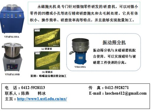 研制的磁性磨料有10种类型以上,可以适用不同的材料和加工精度要求,粒径大小在20μm-1000μm范围内。兼具磁性和研磨性,且研磨性能良好,使用寿命长。可适用于玻璃、轻质合金、铸铁、铜铝合金、高碳钢、合金钢和轴承钢系列材料。