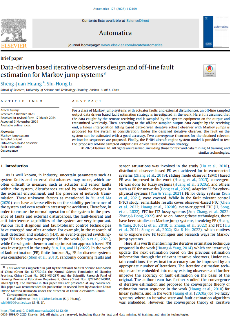 多宝(中国)一站式服务官网“数学方法与智能控制理论”团队首次在该顶级期刊发表学术成果“Data-driven based iterative observers design and off-line fault estimation for Markov jump systems,Automatica,2025,173:112109”。该学术成果是由科研团队负责人黄胜绢(S.-J.Huang)教授及其指导的研究生李世鸿(S.-H.Li)合作完成。该学术成果主要针对一类具有马尔可夫跳变的控制系统,通过系统的离散采样输出数据,结合线性插值拟合方法构建了一种基于数据驱动的迭代观测器,实现了对系统的状态和故障的准确估计,从而完成对系统的远程故障诊断。同时,该学术成果提出了一种积分序列收敛性理论,确保逼近残差在一定条件下是收敛的,突破了传统故障估计方法只能确保逼近残差范数有界的局限,在确保系统安全性和可靠性方面有着重要的理论和应用价值。