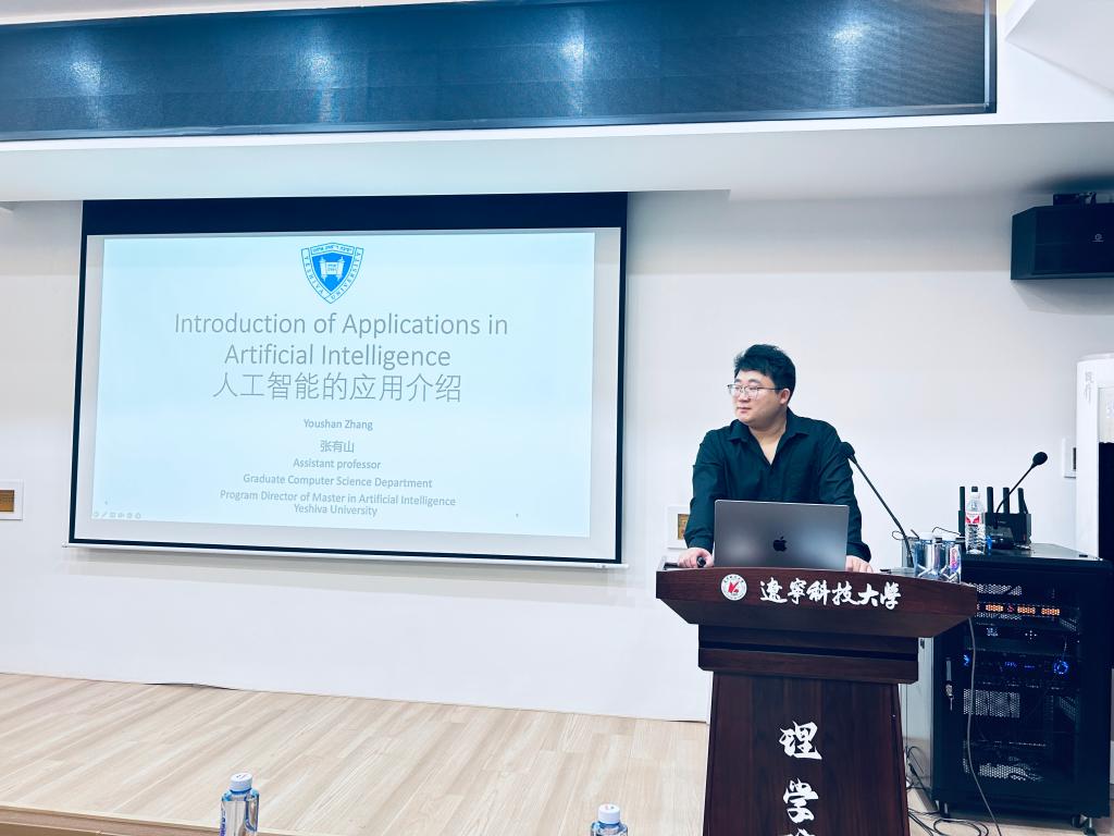 6月26日,多宝官网理学院在明贤楼B315教室成功举办了题为“Introduction of Applications in Artificial Intelligence”的学术报告会。本次报告会由理学院主办,吸引了众多相关研究领域的教师以及研究生到场聆听,现场气氛热烈,学术氛围浓厚。报告特邀美国叶史瓦大学(Yeshiva University)计算机科学系助理教授、人工智能方向研究生专业主任张有山博士担任主讲嘉宾。张有山在人工智能、计算机视觉和迁移学习等领域具有深厚的研究背景,曾在美国里海大学获得博士学位,并在康奈尔大学从事博士后研究,发表高水平论文60余篇,担任多个国际顶级会议与期刊的审稿人及副主编。
