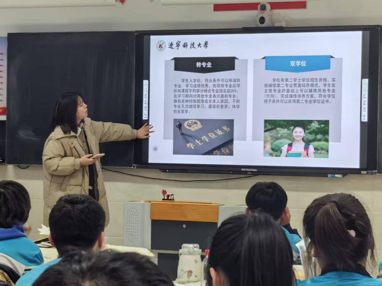 活动期间,四位同学在各自母校老师的热情协助下,精心筹备了一系列内容翔实、形式多样的宣讲活动。他们不仅详细介绍了各自所在大学的学习环境,包括图书馆资源、实验室设施、学术讲座与科研项目等,让学弟学妹们对高等教育的广阔天地有了更加直观的认识,还生动描绘了大学的生活场景,从丰富多彩的社团活动到温馨和谐的宿舍文化,每一个细节都旨在激发同学们对大学生活的无限憧憬。