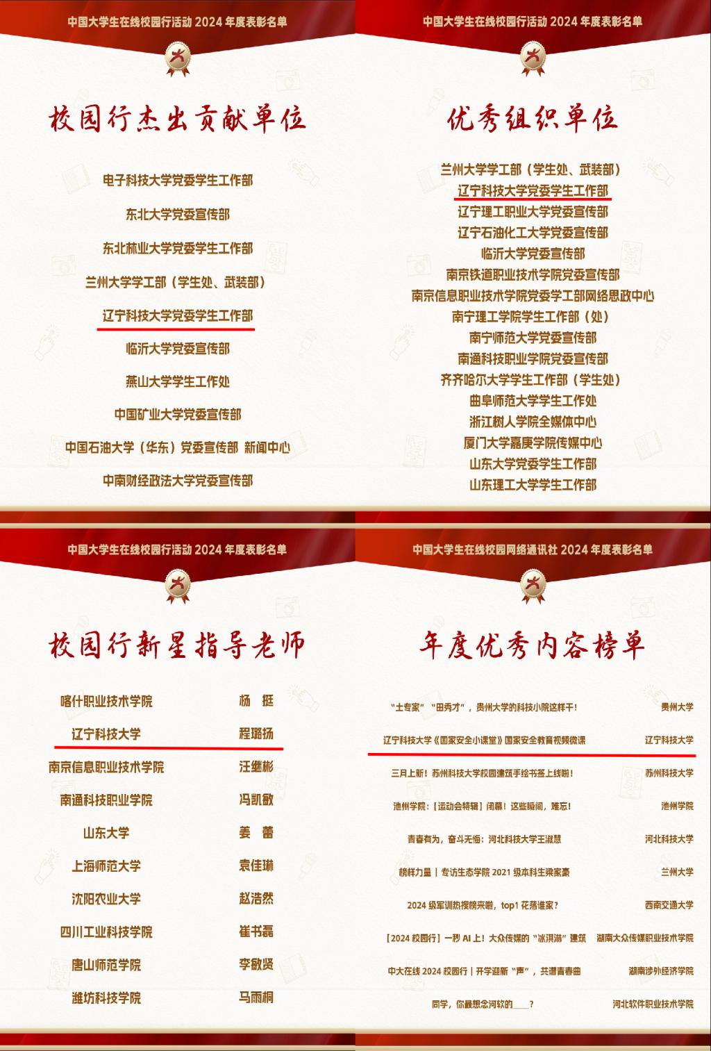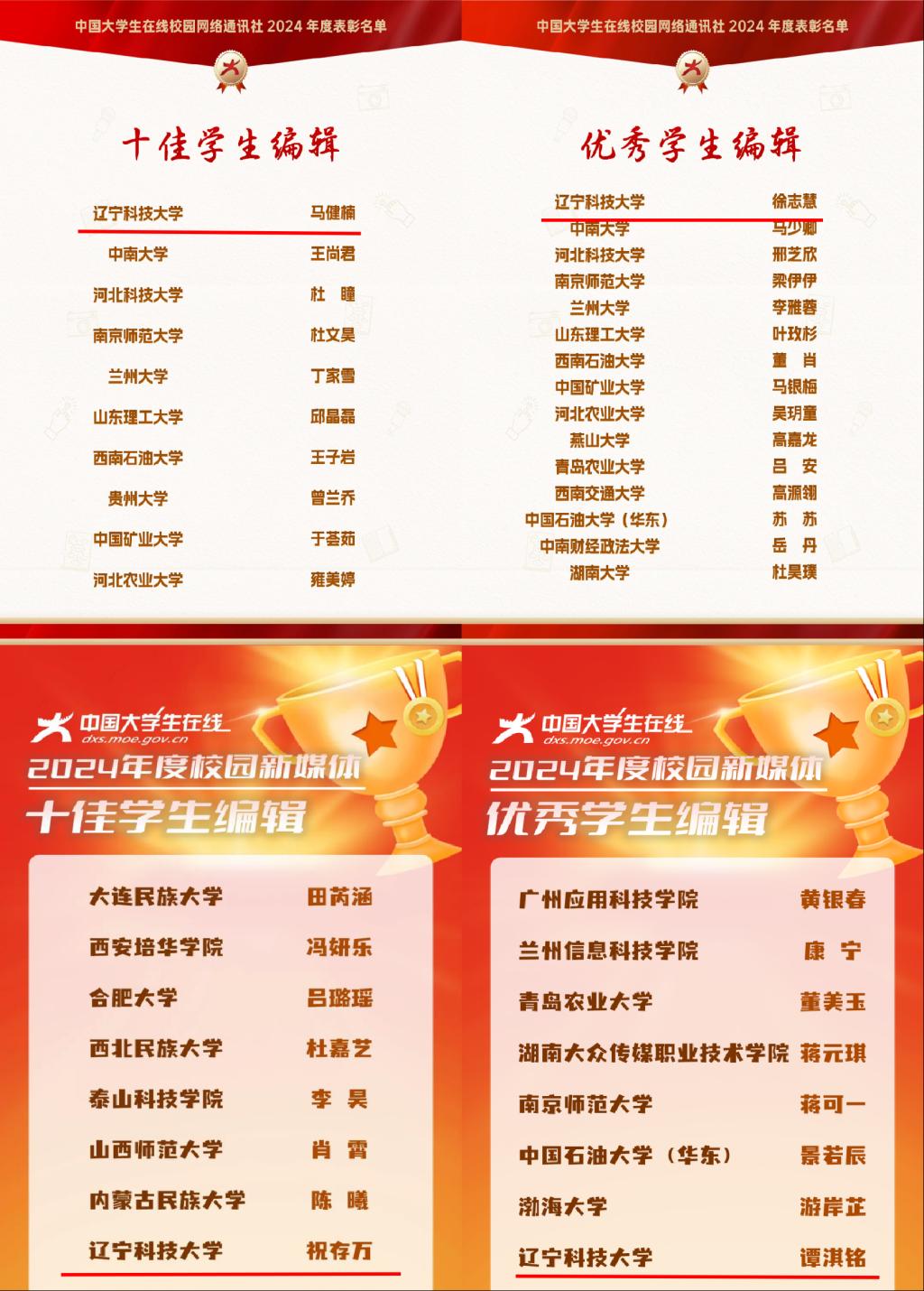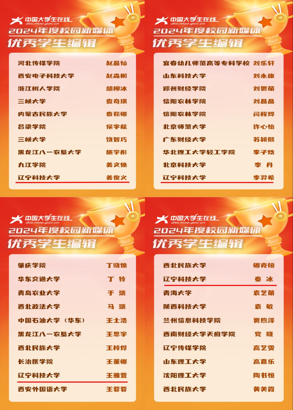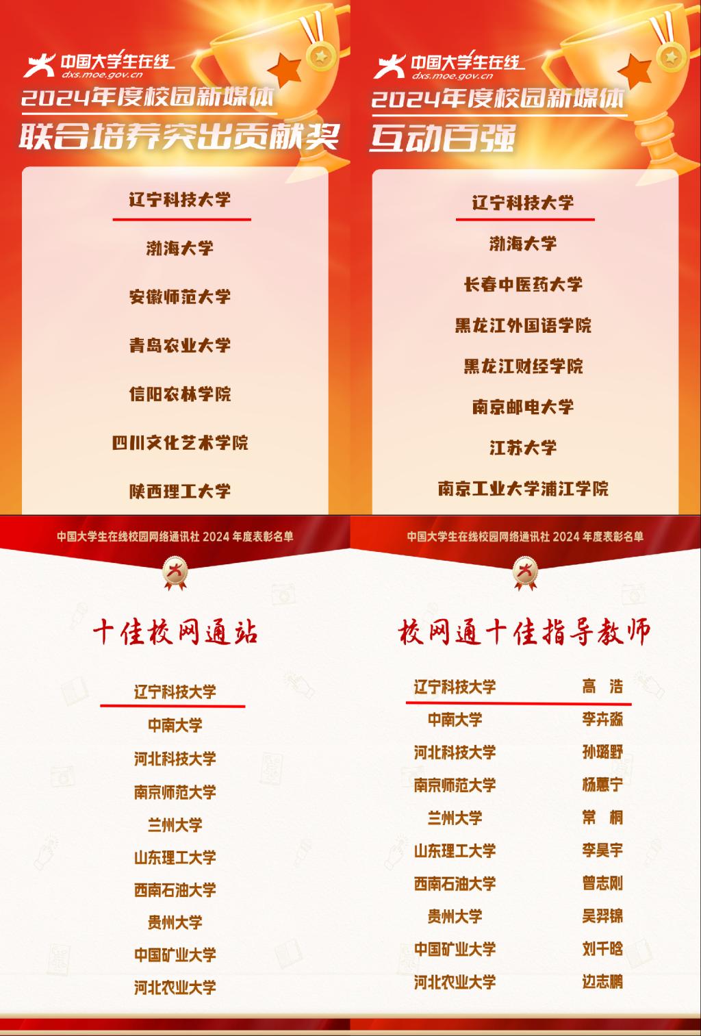 近日,教育部中国大学生在线先后公布2024年度校园新媒体表彰名单、2024年度校网通及校园行活动表彰名单。多宝官网获评全国“2024年度校媒人联合培养突出贡献奖”(全国15所,辽宁省3所),“校园行杰出贡献单位”(全国10所,辽宁省2所),“校园新媒体互动百强”“校园行活动优秀组织单位”,校网通站连续7年获评“十佳校网通站”(全国10所,辽宁省1所),10名师生获评“校网通十佳指导教师”“十佳学生编辑”等,集体及个人共获16项荣誉。