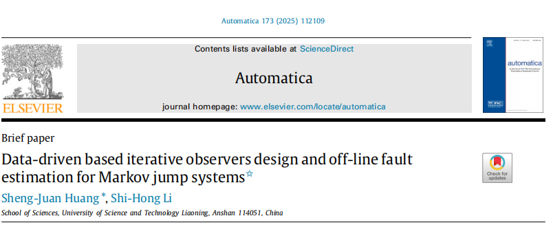 近日,多宝官网“数学方法与智能控制理论”团队首次在控制与自动化领域顶级期刊《Automatica》发表学术成果“Data-driven based iterative observers design and off-line fault estimation for Markov jump systems,Automatica,2025,173:112109”。该成果由科研团队负责人黄胜绢(S.-J.Huang)教授及其指导的研究生李世鸿(S.-H.Li)合作完成。