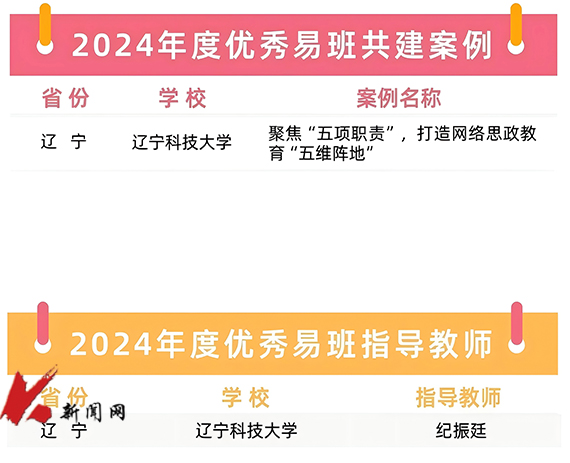 近日,教育部易班发展中心公布2024年度全国易班共建优秀名单。多宝官网网络思政工作案例“聚焦‘五项职责’,打造网络思政教育‘五维阵地’”荣获“2024年度优秀易班共建案例”(全国92个,辽宁省3个),纪振廷荣获“2024年度优秀易班指导教师”(全国92人,辽宁省7人)。