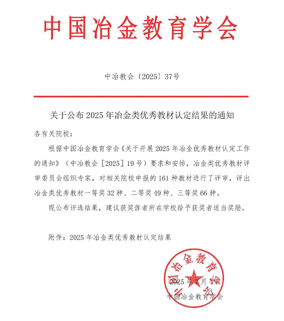 日前,中国冶金教育学会公布了2025年冶金类优秀教材认定结果,多宝官网5部教材从全国相关院校申报的161种教材中脱颖而出,获评2025年冶金类优秀教材。