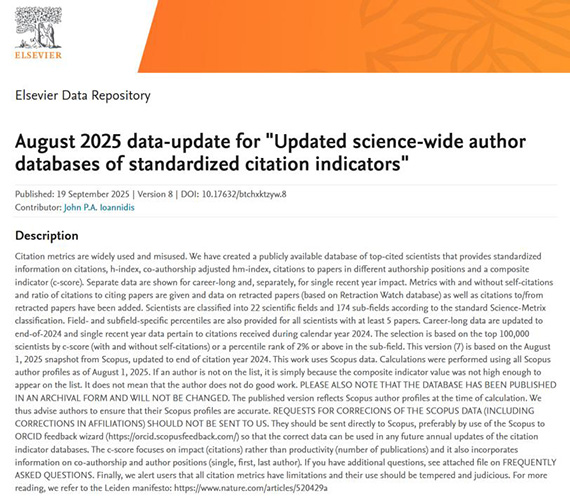 该榜单基于标准引文指标的全科学作者数据库,从全球近700万名科学家中甄选出各学科领域排名前2%的学者,覆盖22个领域和174个子学科。排名主要依据六类核心指标,总引用量、H指数、共同作者修正的Hm指数、单独作者文章的引用量、单独或第一作者文章的引用量和单独、第一或最后作者文章的引用量,能够更客观、更真实地反映科学家的产出量和学术影响力,为科学家长期科研表现提供了一个衡量指标。(供稿单位:图书馆 图片来源:图书馆)