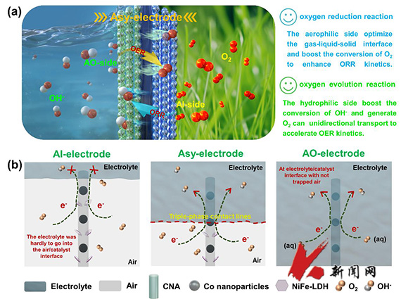 可充电锌-空气电池 (ZAB) 因其理论能量密度高、结构简单、环境友好、成本效益高等优点,被认为是一种理想的能量系统。ZAB以金属锌为阳极、空气为阴极,其放电和充电过程分别对应发生在空气阴极上的氧还原反应 (ORR) 和氧析出反应 (OER)。由于ORR和OER的反应动力学均很缓慢,因此,构建具有高效ORR/OER双功能催化剂的空气阴极,对于催化剂的本征活性和活性位点的可及性起到至关重要的作用。然而,多相气-液-固反应在ORR/OER过程需要合理的电极设计以提供与多相反应动力学相匹配的优化界面。为解决这一问题,该研究设计并制备了一种不对称阴极 (Asy-electrode ),以碳布上包裹Co纳米颗粒的碳纳米管阵列 (CNAs) 作为亲气侧 (AI-side) 匹配并增强ORR动力学,另一侧以镍铁层状双金属氢氧化物 (NiFe-LDH) 沉积在CNAs上作为疏氧(亲水)侧 (AO-side) 提高OER动力学。这种独特的电极结构设计有效平衡了O2和OH-的吸附和解吸,促进了气相和液相反应物及产物的传质、吸附和解吸。这种不对称阴极用于锌-空气电池,展现出高功率密度、比容量和倍率性能,且在高电流密度下具有优异的长循环充放电稳定性,电极两侧的亲气/亲水界面结构增强了阴极上的动力学,改善了充放电反应的可逆性。