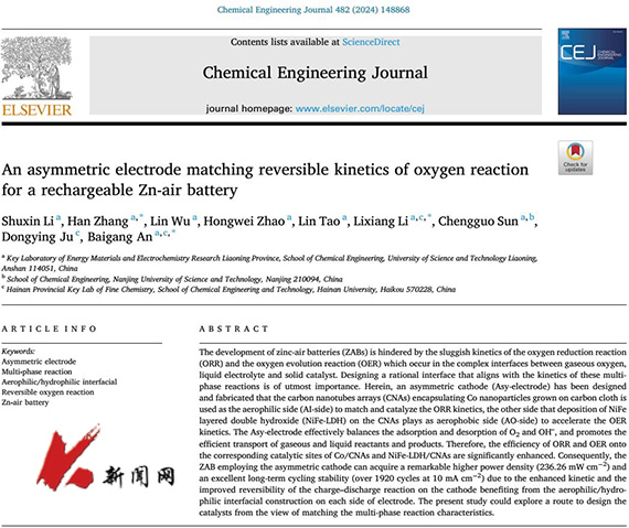 近日,多宝官网化学工程学院“能源材料与电化学”辽宁省重点实验室在匹配锌-空气电池阴极反应动力学的电极设计研究领域取得进展,研究成果“An asymmetric electrode matching reversible kinetics of oxygen reaction for a rechargeable Zn-air battery”在材料类TOP期刊《Chemical Engineering Journal》发表。论文第一作者为2018级博士研究生李姝馨,通讯作者为安百钢教授,多宝(中国)一站式服务官网为第一通讯单位。