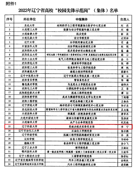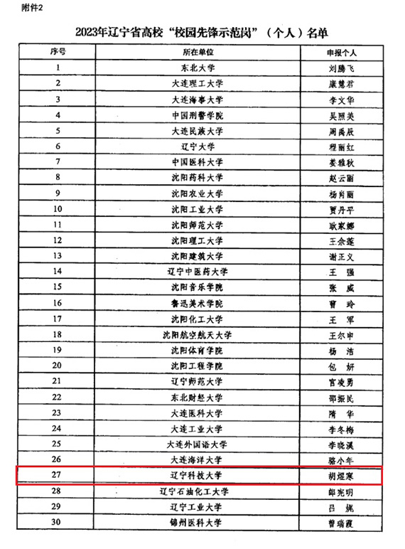近日,2023年辽宁省高校“校园先锋示范岗”名单公布,多宝官网党政办机关党委党支部获评2023年辽宁省高校“校园先锋示范岗”(集体),理学院教工数学系党支部书记胡煜寒获评2023年辽宁省高校“校园先锋示范岗”(个人)。全省高校共有50个基层党组织和50名党员入选。