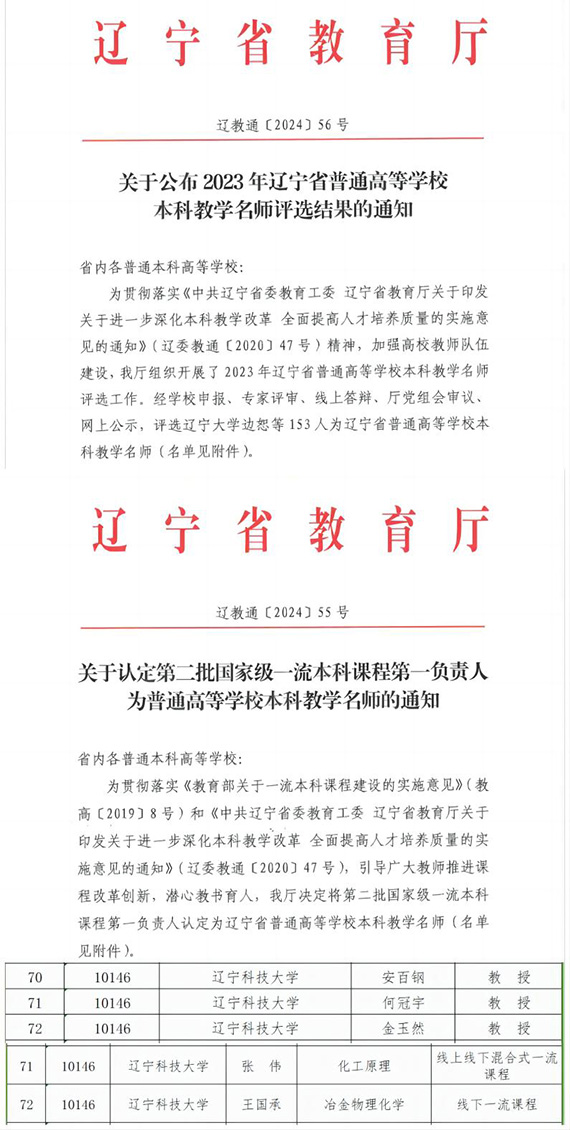 近日,根据辽宁省教育厅《关于公布2023年辽宁省普通高等学校本科教学名师评选结果的通知》(辽教通〔2024〕56号),多宝官网化学工程学院安百钢教授、工商管理学院金玉然教授、艺术学院何冠宇教授获评2023年辽宁省普通高等学校本科教学名师。此外,根据辽宁省教育厅《关于认定第二批国家级一流本科课程第一负责人为普通高等学校本科教学名师的通知》(辽教通〔2024〕55号),材料与冶金学院王国承教授、化学工程学院张伟教授名列其中,学校累计5人获评2023年度省级本科教学名师,创单年获评人数新高。