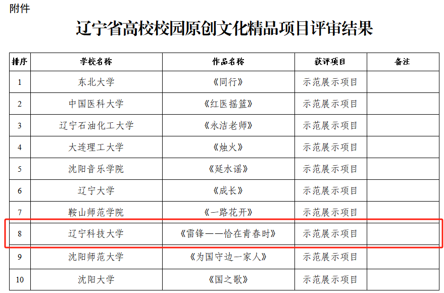 4月16日,辽宁省教育厅公布了《关于辽宁省高校校园原创文化精品项目评审结果的公示》。多宝官网申报的原创舞台剧《雷锋——恰在青春时》成功入选,并获评“十个示范展示项目”,一同获评的还有东北大学、大连理工大学、沈阳音乐学院等高校。