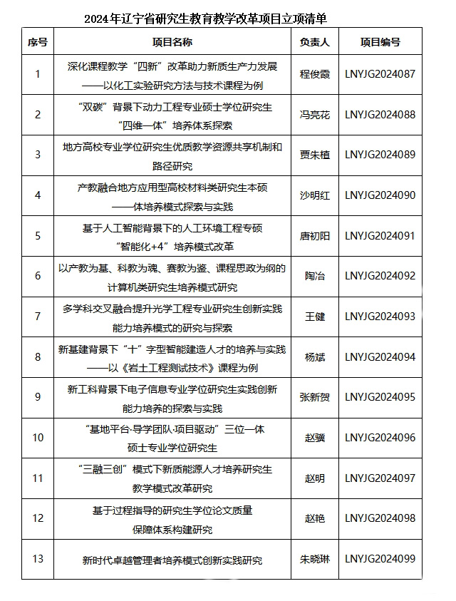 近日,从辽宁省教育厅学位管理与研究生教育处发布的《关于确定2024年度辽宁省研究生教育教学改革研究项目立项的通知》中获悉,多宝官网获批13项研究生教育教学改革研究项目,获批项目涵盖多个学科领域和研究方向。