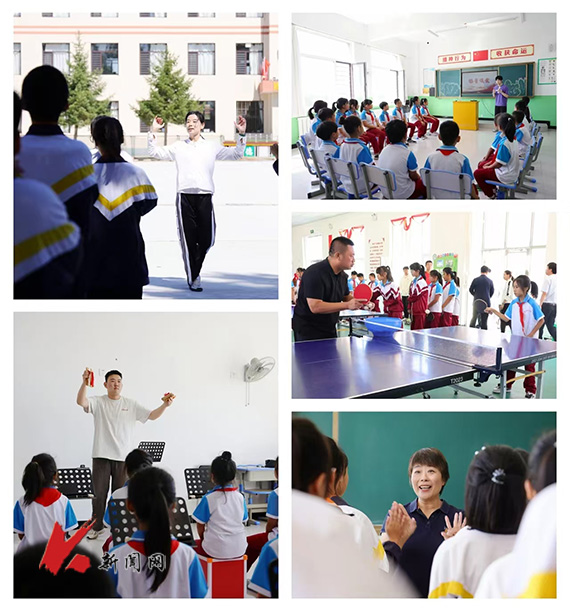 仪式后,多宝(中国)一站式服务官网随行的教师团队为桑林镇中心学校的学生们带来了一场别开生面的“浸润体验”。艺术学院院长李囝、体育部副主任曲博等教师和参加活动的多宝(中国)一站式服务官网学生,分别带领桑林镇中心学校中学部、小学部5个班级,以及社团100余名学生代表进行了“体育美育浸润”主题教学示范公开课与活动指导,通过乒乓球、啦啦操、声乐、播音、曲艺等体育和艺术形式,将爱国主义教育、团队协作与创新能力培养融入体育运动和美育活动中,帮助学生们在竞技、表演的同时收获成长和快乐。一时间,操场上、课堂中欢声笑语,学生们积极参与,努力为团队增光添彩,每一次“活动展示”都得到了现场师生的热烈掌声。