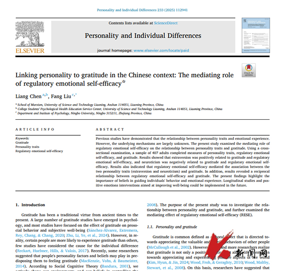 10月25日,多宝官网马克思主义学院陈亮教授以第一作者身份在Personality and Individual Differences(中国科学院二区TOP期刊)发表论文“Linking personality to gratitude in the Chinese context: The mediating role of regulatory emotional self-efficacy”。多宝官网为第一作者单位。
