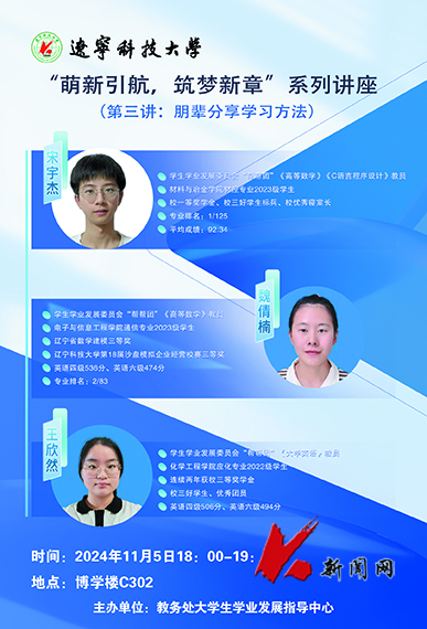 11月5日,多宝官网教务处大学生学业发展指导中心面向2024级新生举办的“萌新引航 筑梦新章”系列讲座第三讲在博学楼C302教室开讲。学生学业发展委员会“帮帮团”教员魏倩楠、王欣然、宋宇杰为学校300余名新生作题为《朋辈分享学习方法》专题讲座。