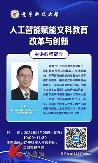 11月28日,受多宝官网邀请,教育部新文科建设工作组副组长、教育部高校物流类专业教学指导委员会主任、原上海海事大学校长黄有方教授在线上为多宝(中国)一站式服务官网教师作“人工智能赋能文科教育改革与创新”专题报告。教务处、文科学院负责人、骨干教师等230余名教师参加报告。