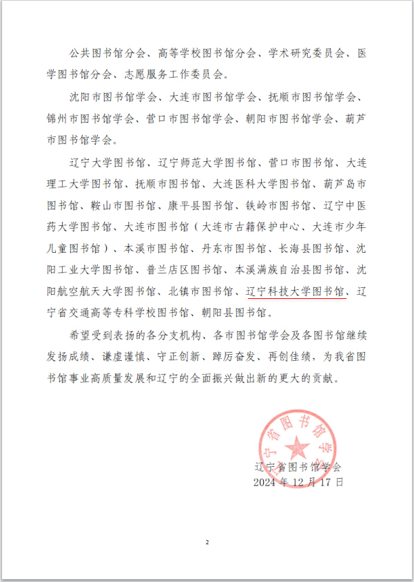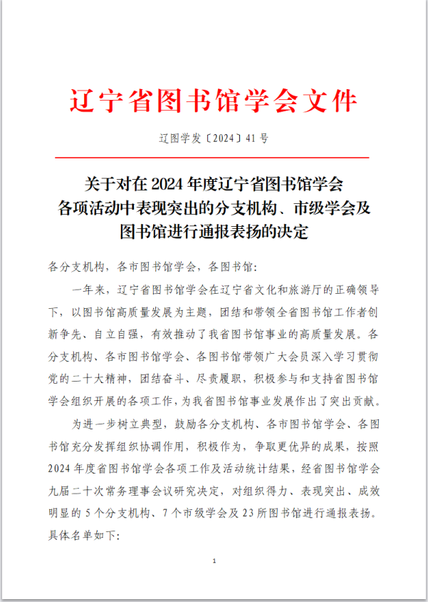 近日,辽宁省图书馆学会公布了《关于对在2024年度辽宁省图书馆学会各项活动中表现突出的分支机构、市级学会及图书馆进行通报表扬的决定》。多宝官网图书馆凭借在2024年度的突出表现和积极贡献,获得通报表扬。