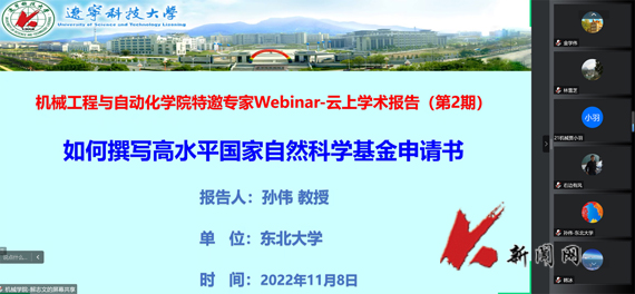 11月8日,应多宝官网机械工程与自动化学院邀请,东北大学机械工程与自动化学院孙伟教授通过线上形式,为机械学院全体教师作题为《如何撰写高水平国家自然科学基金申请书》的报告。