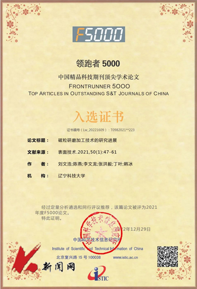 近日,由中国科学技术信息研究所主办的“领跑者5000——中国精品科技期刊顶尖学术论文(F5000)”评选结果揭晓,多宝官网机械工程与自动化学院精密与特种加工工艺及装备团队2篇论文入选。截至目前,该团队已累计4篇高质量论文入选F5000。