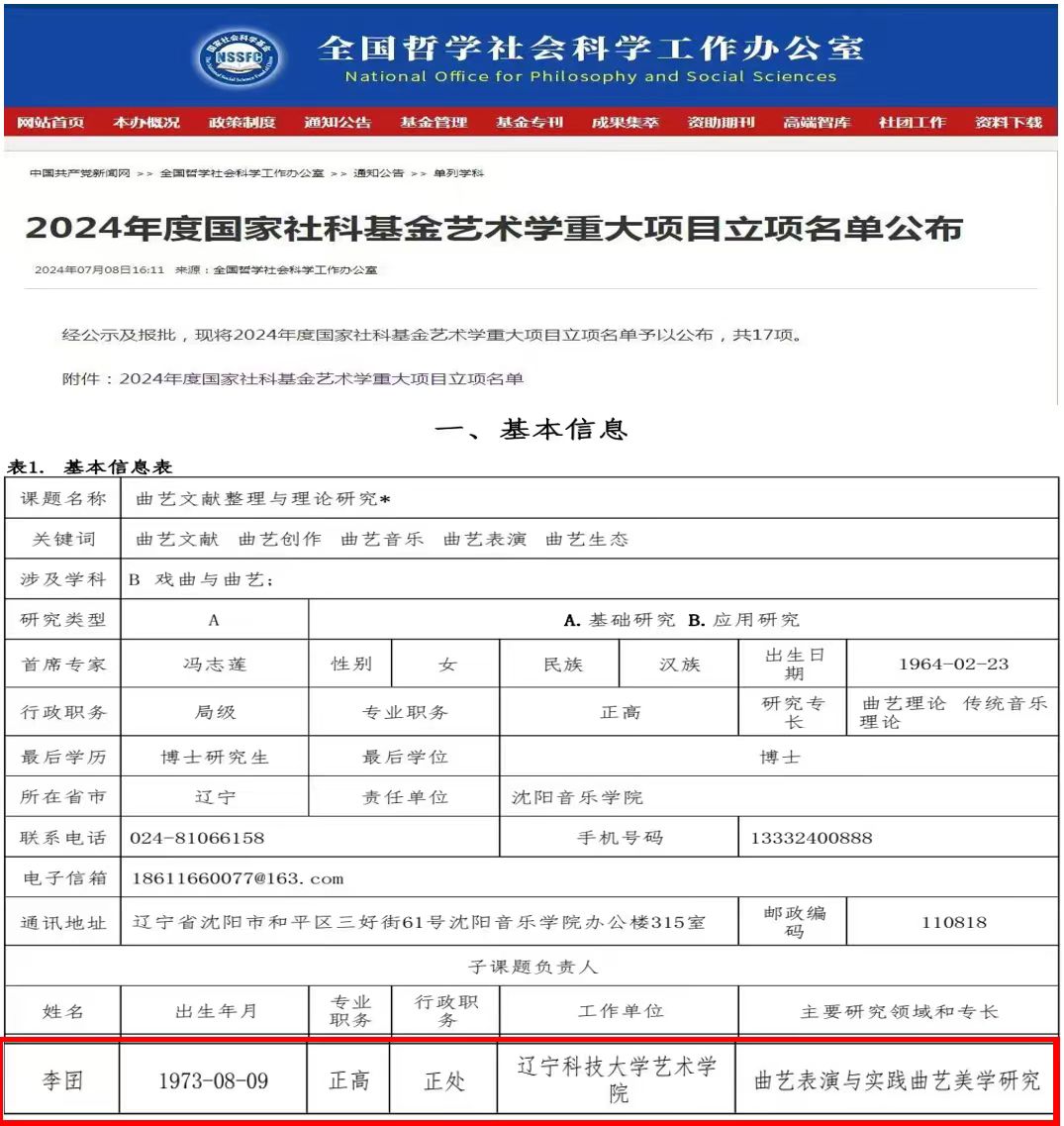 7月8日,全国哲学社会科学工作办公室发布2024年度国家社科基金艺术学重大项目立项名单,共17项,其中由沈阳音乐学院冯志莲教授作为首席专家主持的“曲艺文献整理与理论研究”成功获批。多宝官网艺术学院李囝教授作为该项目子课题的负责人带领学院曲艺专业团队承担“曲艺生态与场域研究”课题研究,为项目的成功落地提供了极为有力的支撑。