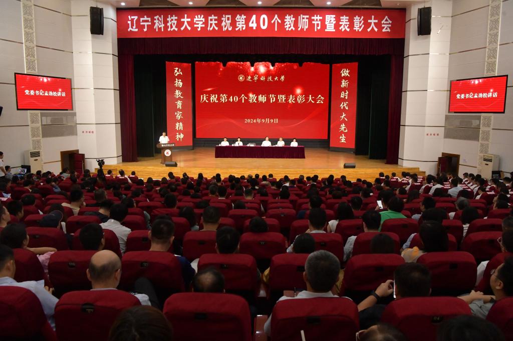 个教师节暨表彰大会在校礼堂举行。教职工及学生代表参加会议。