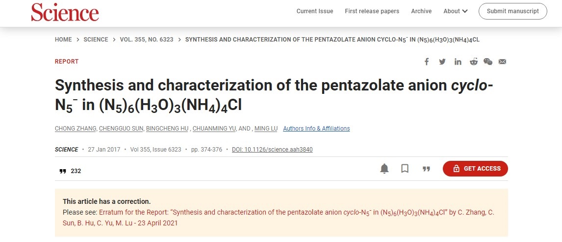 该论文阐述了世界上首次合成以5个氮原子组成的环状阴离子化合物“pentazolate”(五唑阴离子)。由于该阴离子分解产物主要是氮气且具有较大的生成焓,可以用于高密度能量材料和火箭的固体推进剂,一直是国内外含能材料领域比较关注的重点。但自1956年它的前驱体芳基五唑被首次合成以来,制备稳定存在的五唑阴离子化合物一直没有取得实质性进展。