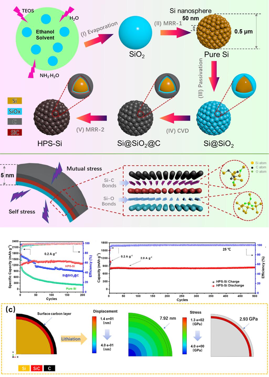 2-x、SiC和C多相层修饰纳米硅球自组装的亚微米级硅构成。这种多级石榴结构硅负极HPS-Si能有效调节硅充放电过程的应力变化以增强了负极电化学循环稳定性能。相关成果“Hierarchical pomegranate-structure design enables stress management for volume release of Si anode”在线发表于《Journal of Materials Science & Technology》。DOI: 10.1016/j.jmst.2023.02.014。论文第一作者为化工学院2019级博士研究生狄方。